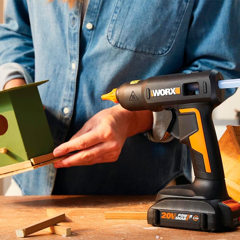 Питание клевого пистолета осуществляется от аккумулятора WORX POWER SHARE 20В.